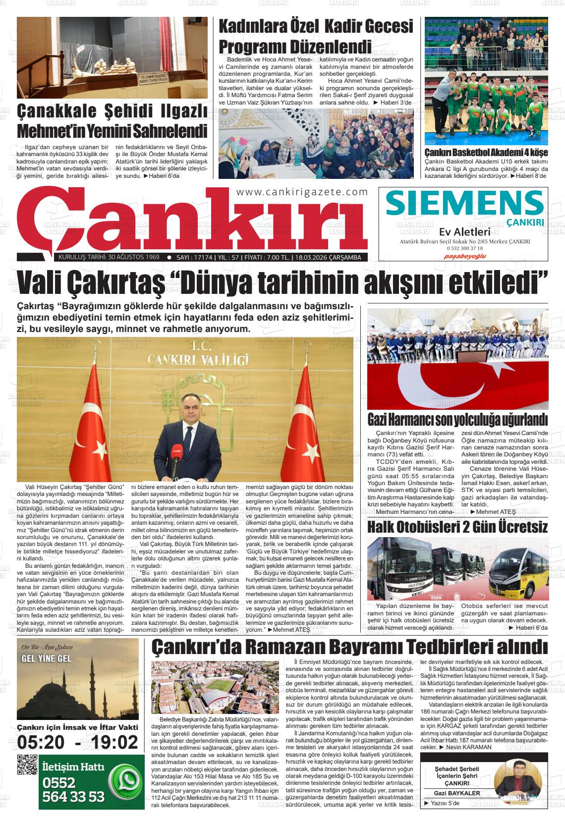 Çankırı Yerel Gazeteleri 14 Mart 2026, Cumartesi Günü Manşeti