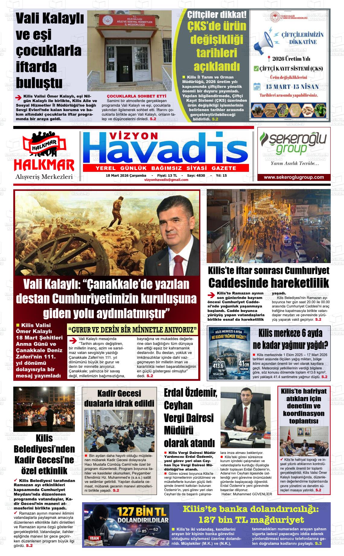 Kİlİs Yerel Gazeteleri 13 Mart 2026, Cuma Günü Manşeti